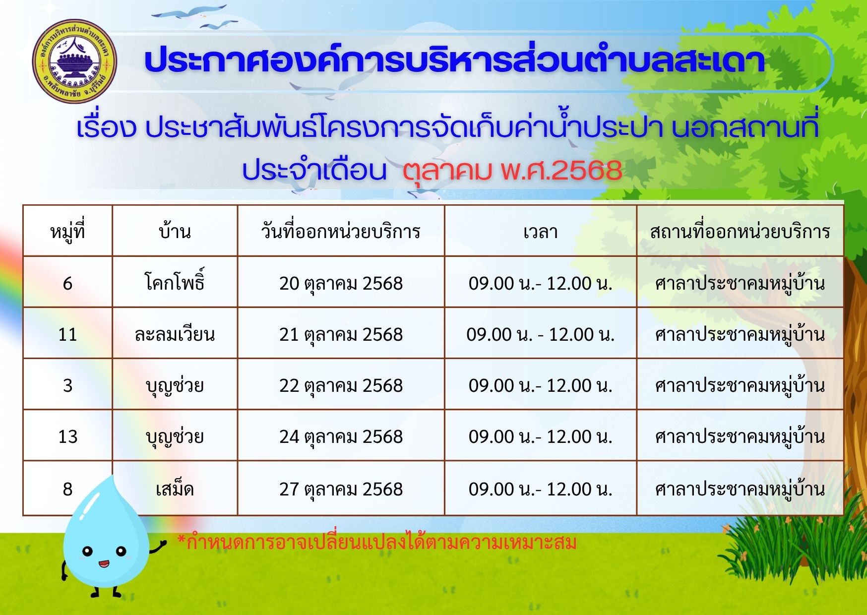 ตารางการจัดเก็บค่าน้ำประปา ประจำเดือน ตุลาคม 2568